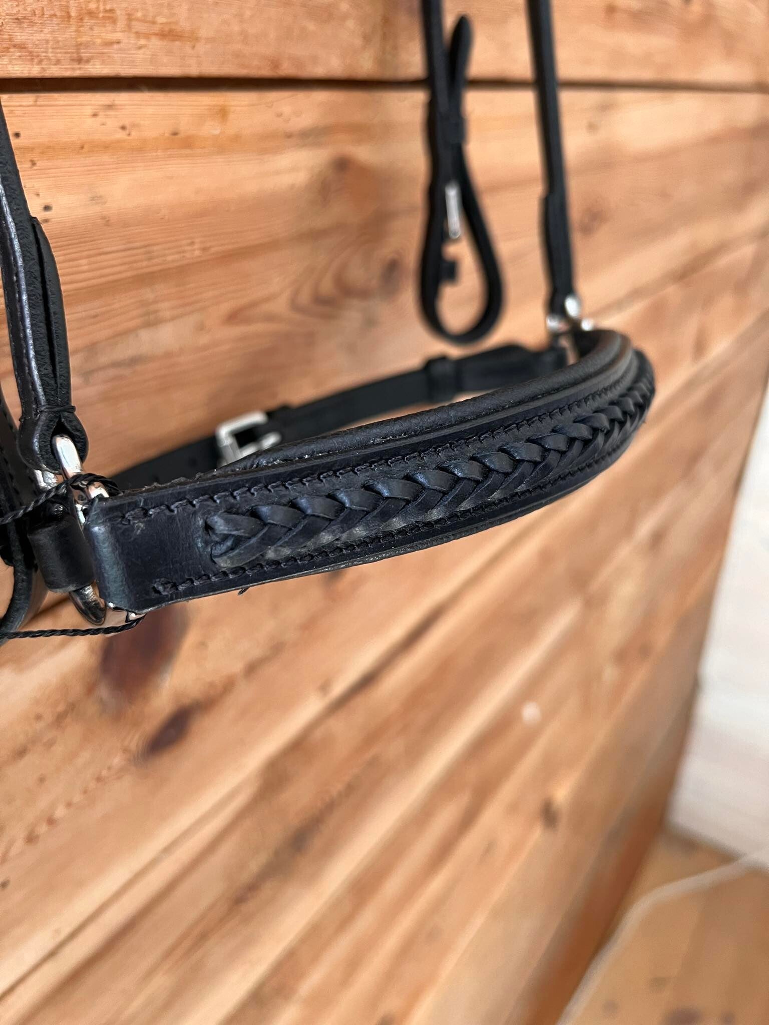 Huvudlag och nosgrimma i svart med handarbetade flätade detaljer.