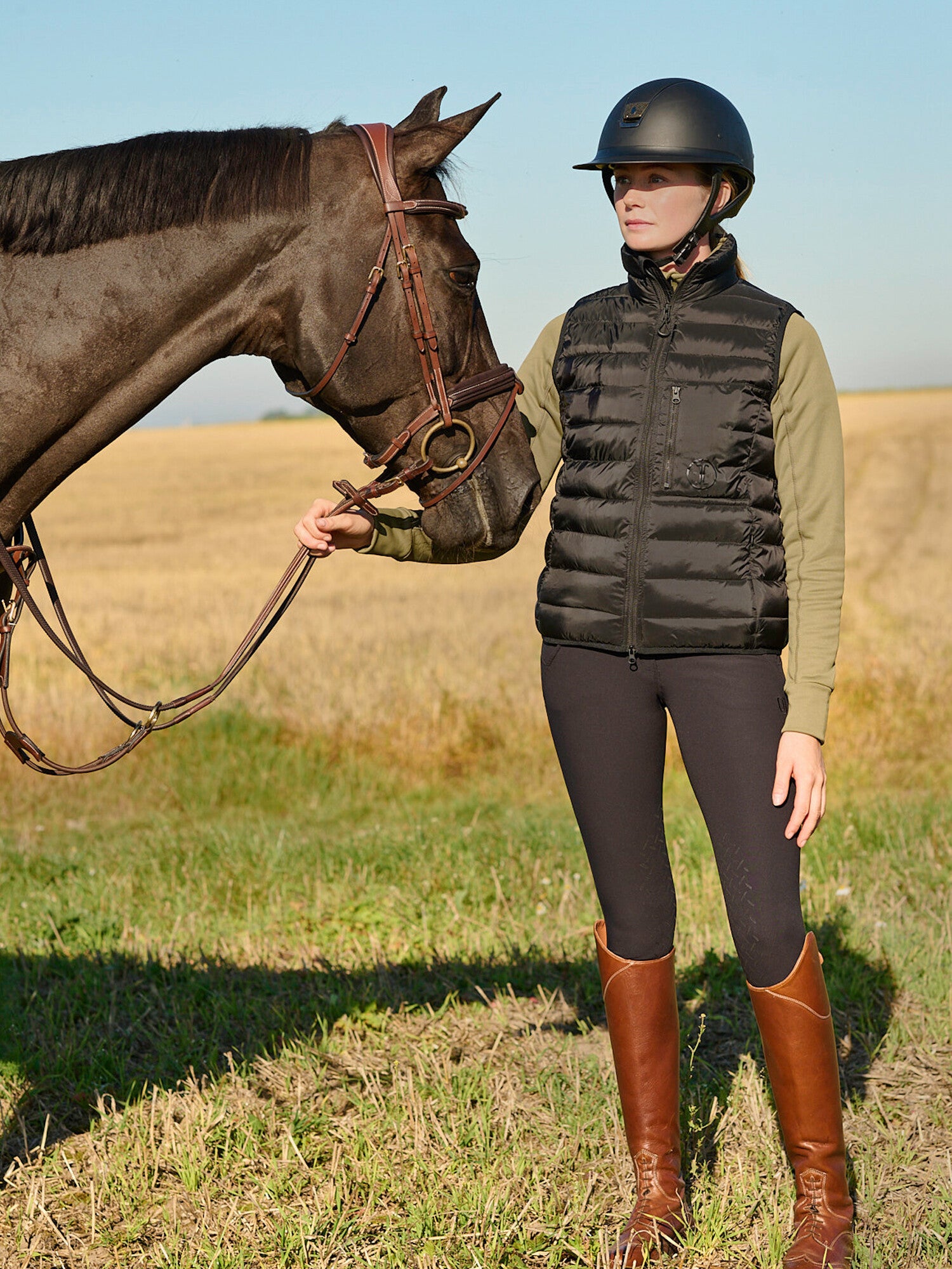 Upplev den ultimata ridsportvästen - vår Lena! Med en dunliknande syntetfyllning och impregnering med Bionic Finish ECO säkerställer vi att du håller dig varm och torr, oavsett om du rider eller står vid sidan av banan. Västen är försedd med tvåvägsdragkedja fram, tre dragkedjeförsedda fickor och elastiskt ärmavslut och nedkant. Lena har en normal passform och ger en snygg look under förslagsvis Berit eller Bodil. Upptäck den bästa kombinationen av kvalitet, komfort och stil med Lena - din nya favoritväst för alla ridsportaktiviteter.